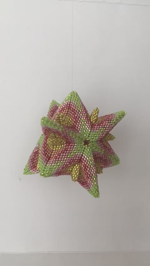 This is a step-by-step tutorial for Capitella Star, a spiky tetrahedron, as pictured above in pink-green (±2,4in./6cm) and blue-yellow (±2,7in./7cm). Both are covered in the tutorial, with clear instructions, pictures and patterns. A materials list is also included.